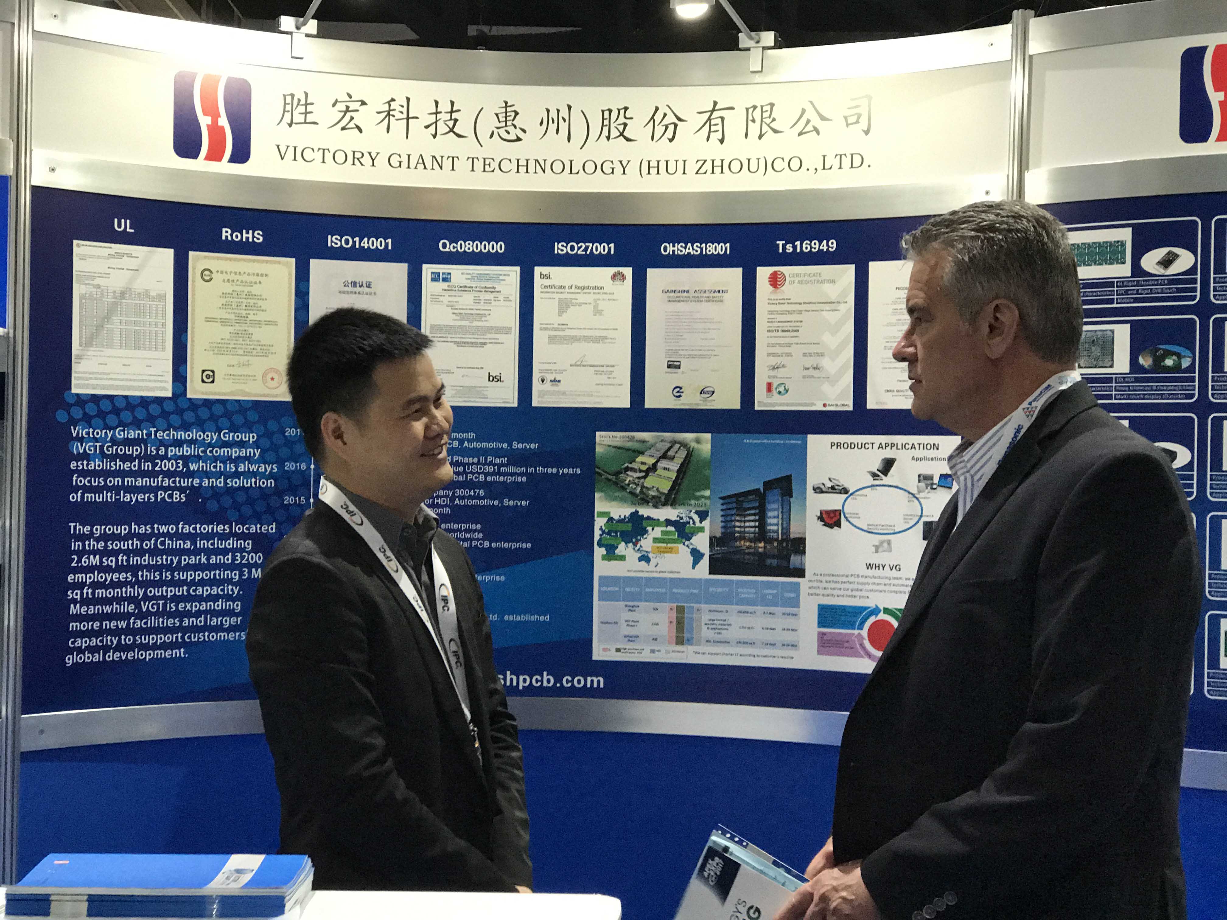 我司抓住每一次国际专业展会的机会,推广自身品牌和产品。第一次参加IPC美国展会就大胆承包了2个标准展位,共计18平米,精心打造了以推广公司产品、技术、规模及企业规划为主的展示平台,为来往的参展人员提供了一次了解555000jcjc公海、认识555000jcjc公海和记住555000jcjc公海的宝贵契机。许多来自国际大品牌公司(比如Intel、新美亚、高通、Plapilot、CML等)的参展人员对我司产生了浓厚的兴趣,与我司代表进行了详细的交谈,了解了公司规划,并肯定了我司的发展前景。